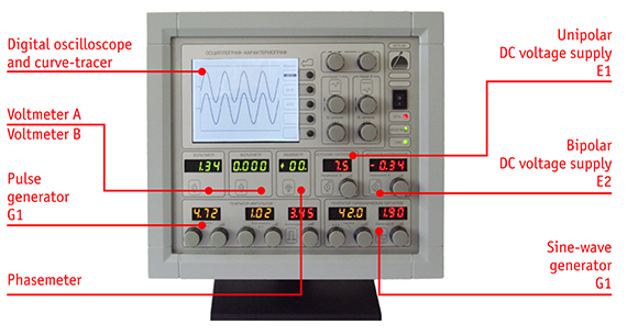 Each workplace consist of instrumental unit (includes 2 PSUs, 2 signal generators, digital voltemeters, phasemeter, digital oscilloscope and curve-tracer) and measurement unit (allows to assembly various electrical and electronic schemes).